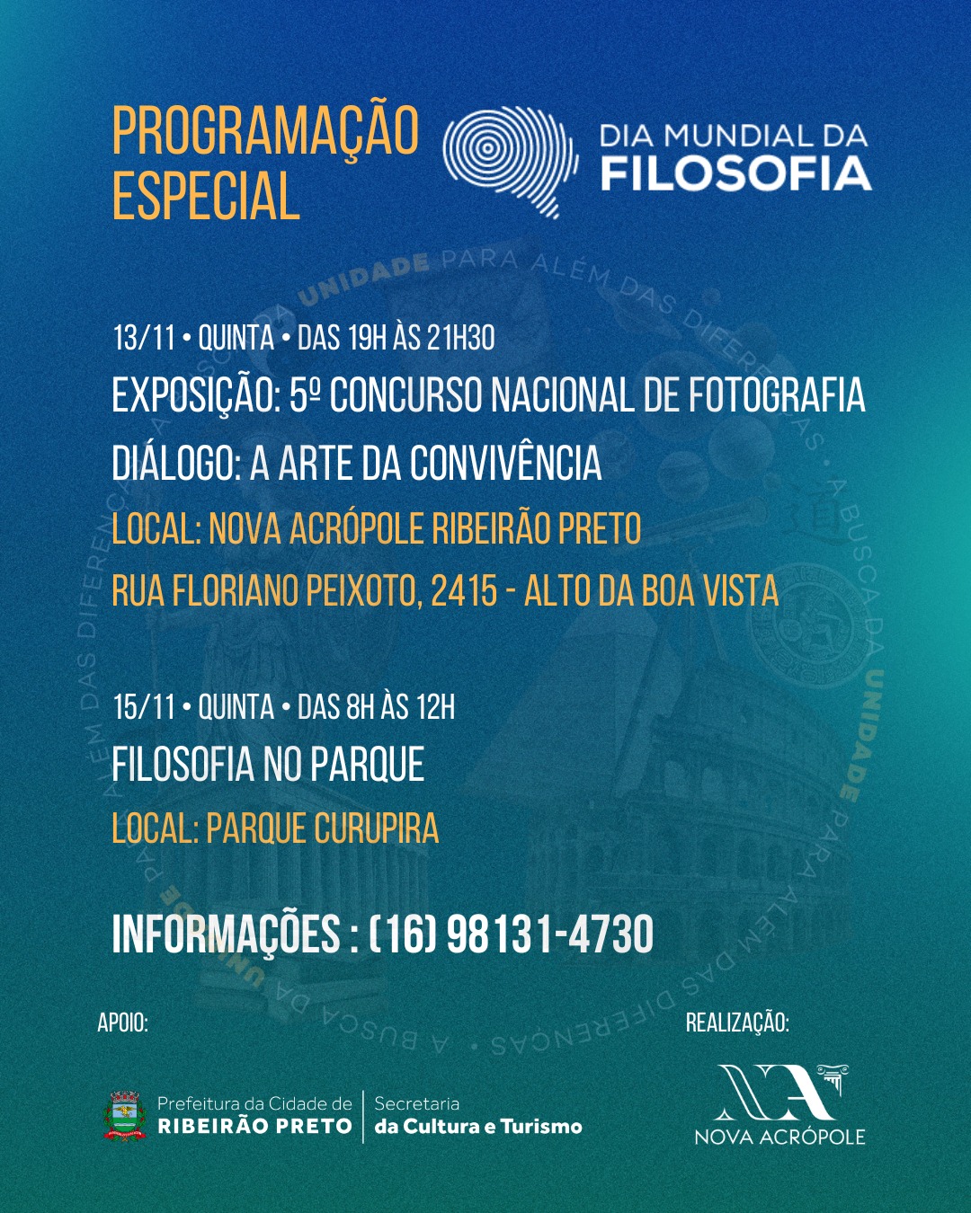 A Nova Acrópole Ribeirão Preto promove, nos dias 13 e 15 de novembro, uma programação gratuita e aberta ao público em homenagem ao Dia Mundial da Filosofia, celebrado anualmente sob iniciativa da UNESCO. O evento conta com o apoio da Prefeitura Municipal de Ribeirão Preto e da Secretaria da Cultura e Turismo, e tem como objetivo incentivar a reflexão sobre o papel da filosofia no cotidiano e a importância do diálogo e da convivência harmoniosa em tempos de polarização.