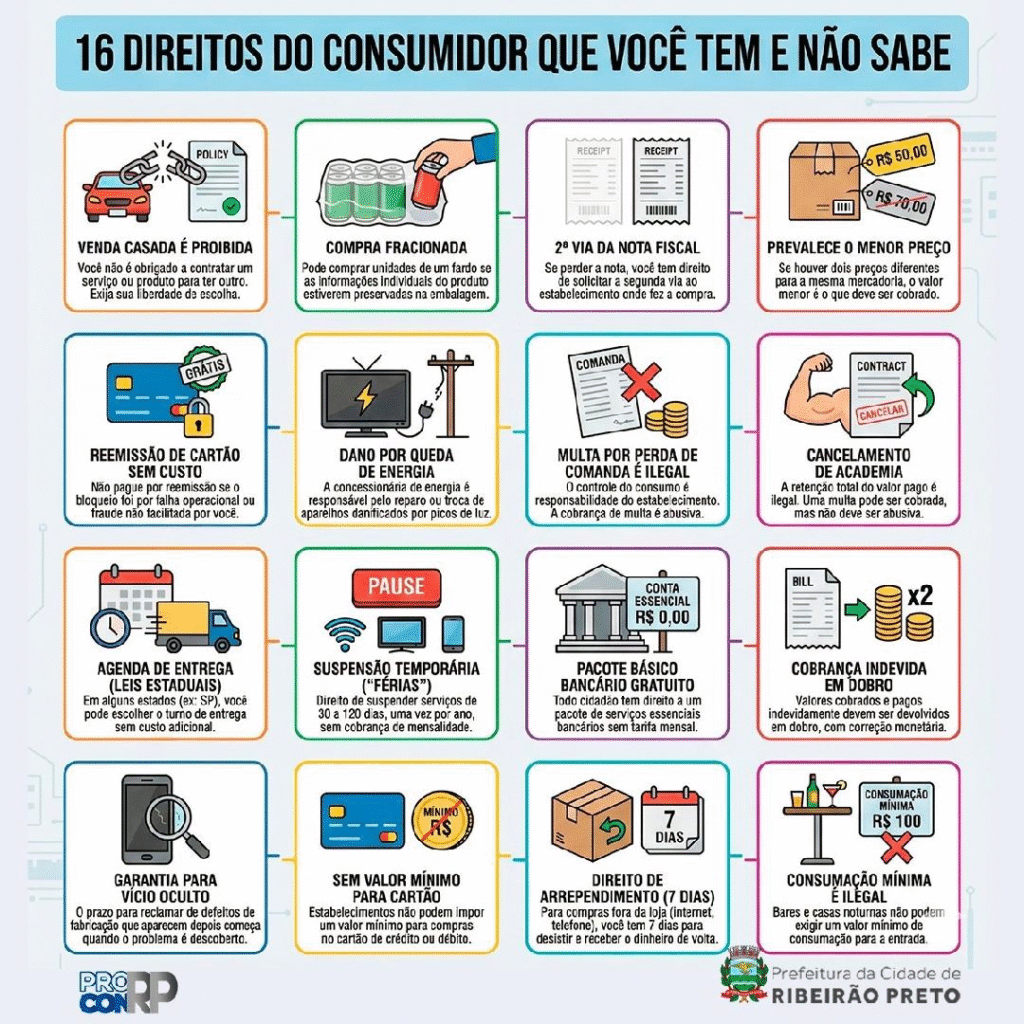 Apesar de ser uma das legislações mais consolidadas do país, o Código de Defesa do Consumidor (CDC) ainda abriga direitos pouco conhecidos e, por isso, raramente exercidos pela população. Em Ribeirão Preto, o Procon Municipal chama a atenção para 16 direitos essenciais que, embora garantidos por lei, acabam sendo ignorados no cotidiano por falta de informação. O órgão alerta que esse desconhecimento favorece a continuidade de cobranças indevidas e práticas abusivas em diferentes setores.